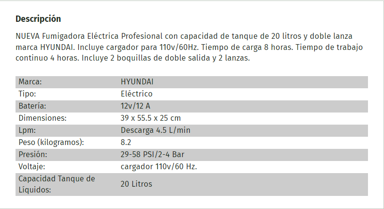 NUEVA Fumigadora Eléctrica Profesional con capacidad de tanque de 20 litros y doble lanza marca HYUNDAI. Incluye cargador para 110v/60Hz. Tiempo de carga 8 horas. Tiempo de trabajo continuo 4 horas. Incluye 2 boquillas de doble salida y 2 lanzas.